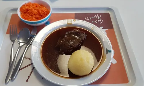 Braten BerniBis jetzt das beste Mensaessen! Wirlich ein Traum! Das Fleisch war sehr gut (zugegeben ohne Soße ein wenig trocken, aber wer isst denn Braten bitte ohne Soße?), Knödel war auch schön gut. Blaukraut hat auch gepasst, in Kombination mit der Soße vielleicht ein wenig sauer. Aber das...