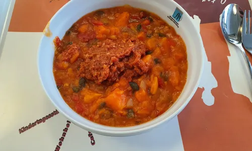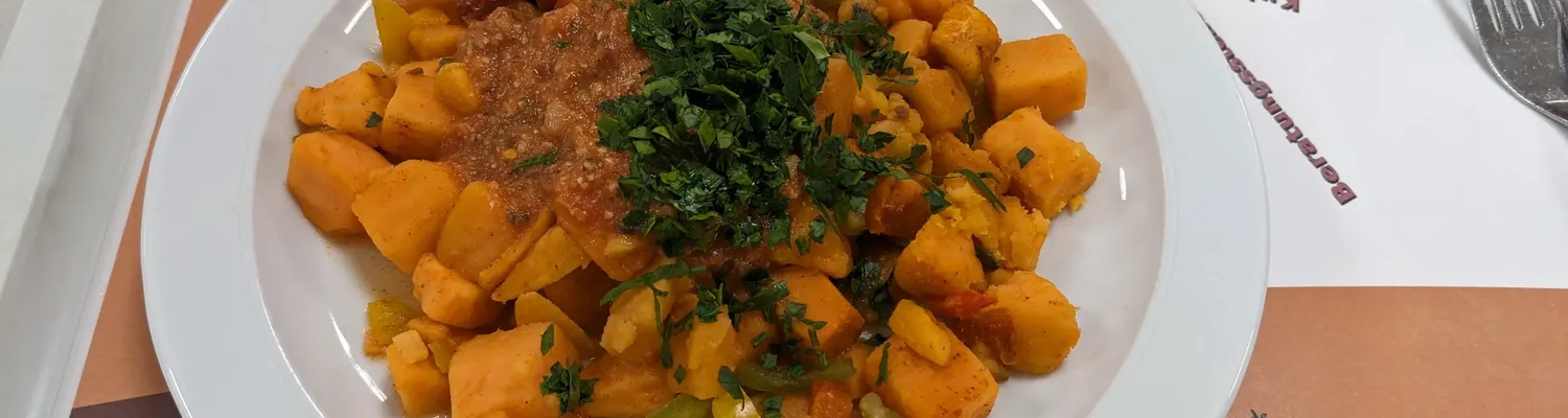 Süßkartoffel StefanBis auf ein paar eiskalte Stücke (? idk was das war) im der sonst sehr warmen Pfanne war das Essen für Mensa-Verhältnisse eigentlich richtig geil.