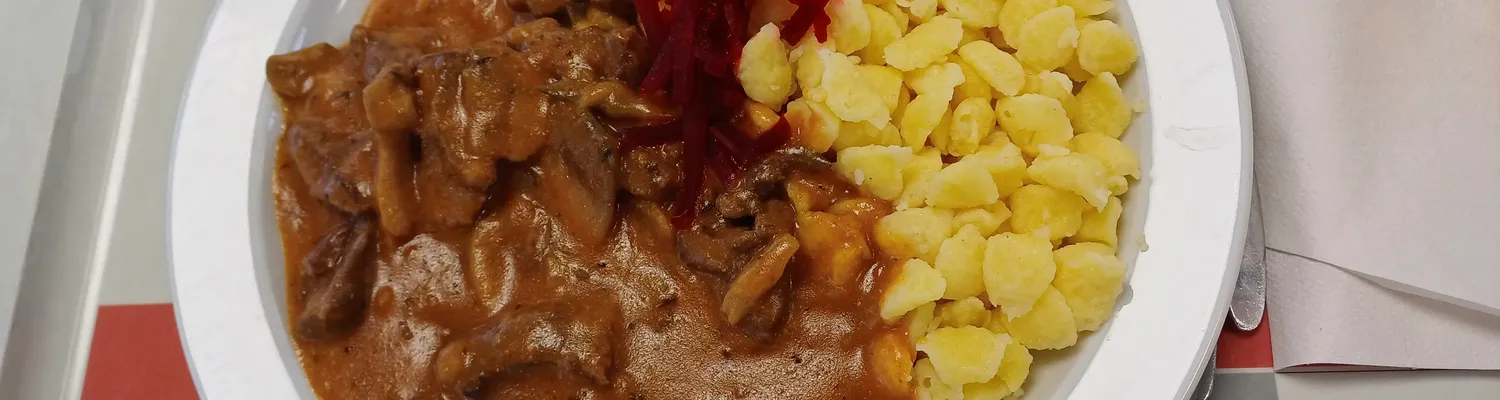 (anonymous)Mittelmäßig guter Geschmack, dafür deftiger Preis. Dafür mal eine andere Konsistenz als bei Standard-Mensa-Gerichten